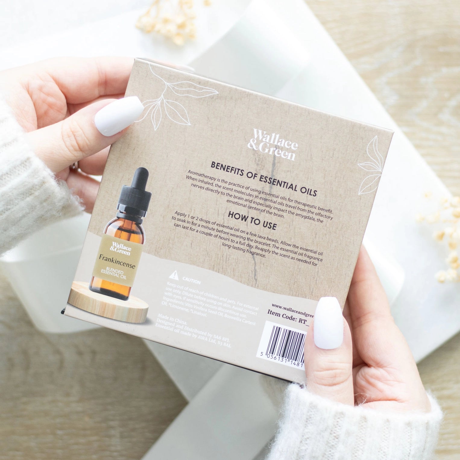 The bracelet also features porous lava beads, which double as an essential oil diffuser. Add a drop of the included frankincense oil to the beads and enjoy its grounding, mood-boosting aroma throughout the day.
